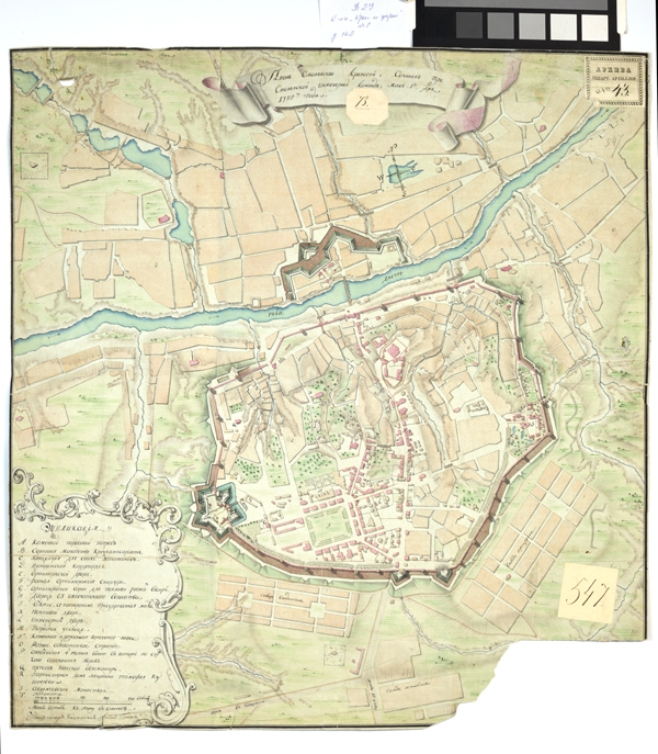 На протяжении XVIII в. крепость, сохранявшая непрерывный контур, была интересна как единый ансамбль. В связи с этим известно большое количество схем и карт плана всего комплекса укреплений. С учетом военного значения города и в целом с укреплением его административного статуса Смоленск все чаще нуждается в оперативном картографическом оформлении, а крепость как основной пространствоорганизующий элемент ярко выделяется на фоне застройки. Примером данного подхода может служить план крепости 1795 г. (рис. 1). Внимание архитектурному своеобразию следует признать минимальным. Цветовое акцентирование контура крепости позволяет составить общее представление об ансамбле ее сооружений.