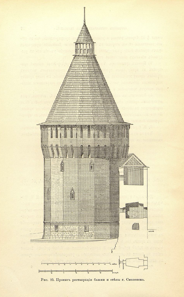 Любопытным памятником является датируемый 1909 г. чертеж многогранной башни, относящийся к материалам Императорской археологической комиссии (рис. 6). Крепостная башня представлена с высокой достоверностью. Чертеж сопровождал доклад, посвященный реставрации крепости. Следовательно, средствами архитектурной графики были представлены готовящиеся к воссозданию детали. Так, гипотетически было допущено устройство смотровой вышки. В дальнейшем подобные варианты не были реализованы на многогранных башнях Смоленской крепости. Внимание графика привлекает предполагаемая к воссозданию мощная пирамида черепичной кровли, обоснованная и в это же время фантастическая для эпохи по своему объему и форме.