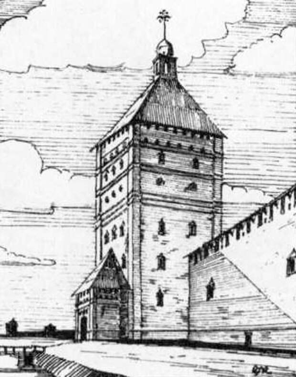 Днепровские ворота, объем которых доминировал в северной части крепости, несомненно, были задуманы зодчими в качестве главной башни крепостной стены. Самое высокое сооружение крепости, повторяющее в композиционном решении и размере Спасскую башню Московского кремля, формировало центр днепровского фасада укреплений. Свое художественное решение графической реконструкции башни предложил выдающийся исследователь В.В. Косточкин (рис. 9). Ученый выбрал ракурс, обостряющий впечатление от величавой призмы Днепровских ворот. Башня трактована как своеобразный небоскреб; исследователю удалось добиться эффекта, производимого высоким столпом на людей позднего Средневековья.