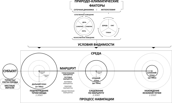 П. Моллеруп выделяет основные стадии пешеходной навигации: определение текущего положения, выбор маршрута и следование к искомой точке [12]. На каждом из этапов ключевую роль играют визуальные ориентиры, среди которых особую значимость приобретают цветовые и световые характеристики объектов пространственной среды. Эти ориентиры, размещенные на различных расстояниях от наблюдателя, формируют плановую структуру восприятия: передний план охватывает ближайшую среду в пределах 50–100 м; средний план распространяется на область около 700 м; дальний план включает более отдаленные участки городской ткани (от 700 м). Визуальная организация маршрута строится на последовательном восприятии зрительных планов (передний, средний и дальний), между которыми перемещается внимание пешехода.