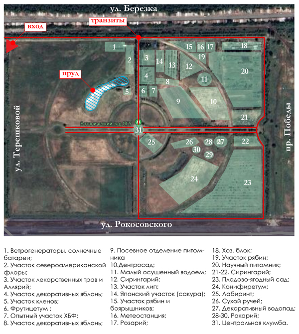 На данный момент коллекционный фонд открытого грунта ботанического сада насчитывает более 350 таксонов различных родов и семейств растений. На территории сада заложены коллекционные участки: кониферетум (хвойные), салицетум (участок ив), фрутицетум (коллекционный участок кустарников), иридарий (коллекционный участок ирисов), пионарий (коллекционный участок пионов), розарий (коллекционный участок роз), сирингарий (коллекционный участок сирени), участок декоративных рябин и боярышников, участок лекарственных растений и др. Собрана коллекция клоновых подвоев яблони. Создано несколько питомников: декоративных древесных плодовых культур (яблони сортов Royalty, Makamik, Сиверса, зонтичная); древесных и кустарниковых растений, интродуцированных в Оренбургской области; различных видов и форм хвойных. Схема ботанического сада представлена на рис. 2.