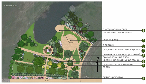Ландшафт организован пересечением радиальных и центральных линий тропиночной сети с круглыми площадками, обозначающими рекреационные зоны: сенсорный сад чувств, тактильная тропа, зона параворкаута, смотровая видовая площадка над прудом и детская площадка.