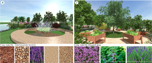 К ассортименту растений, применяемому в грядах и для наполнения тактильной тропы, предъявлялись следующие требования: приятный аромат зелени и разнообразных поверхностей в виде мульчи, коры, шишек и т. д.; выраженная фактурность и текстура; не аллергенность; безопасность при контакте. В этой связи требуемого чувственного эффекта от контакта с растениями и декоративной отсыпкой можно достичь, используя текстурированные растения, ароматные цветы и травы, фактурную декоративную отсыпку, звуковые элементы (колокольчики, водные объекты), съедобные травы и листья кустарников. Использование в проекте различных материалов для дорожек, проходящих через участки сада, будет способствовать пробуждению у потребителя интереса к исследованию территории. Посетитель двигается по определенному направлению. В движении меняются окружающая среда (форма, цвет, запах, звук, температура, тактильность) и картина восприятия.