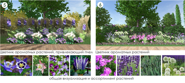 Композиции цветников одновременно воздействуют на несколько чувств человека: слух и обоняние или слух, зрение, обоняние и др. Предлагаются цветники, которые в течение сезона цветения привлекают бабочек. Цветовое решение преимущественно в гамме аналоговой триады, состоящей из синего, фиолетового и светло-бордового оттенков (рис. 5). Подбор растений осуществляется с учетом четвертой зоны морозостойкости. Предусмотрено наполнение пространства ботанического сада высокими деревьями, создающими тень (тополь пирамидальный, орех маньчжурский, дуб, рябина, ель). В проекте используются породы растений без шипов, колючек, неядовитые и неаллергенные. Применяются преимущественно рядовые посадки деревьев и кустарников для формирования кромок путей пешеходного движения. Граница озелененных эксплуатируемых площадок, примыкающая к путям пешеходного движения, не должна иметь перепада высот, бордюров, бортовых камней высотой более 4 см.