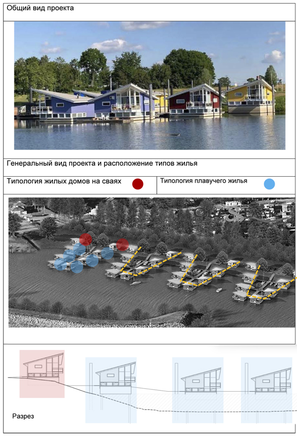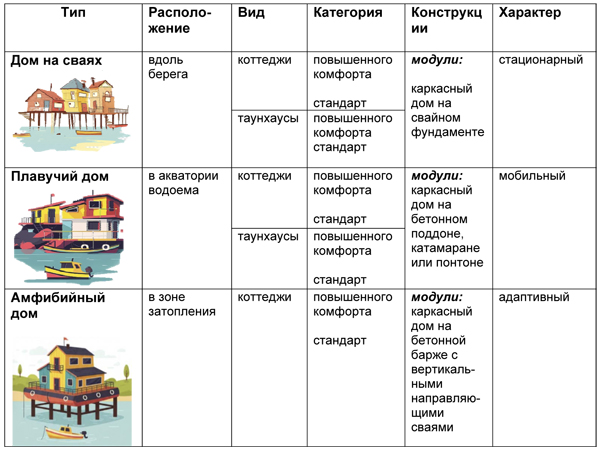 Тип Расположение Вид Категория Конструкции Характер Дом на сваях вдоль берега коттеджи повышенного комфорта стандарт модули: каркасный дом на свайном фундаменте стационарный таунхаусы повышенного комфорта стандарт Плавучий дом в акватории водоема коттеджи повышенного комфорта стандарт модули: каркасный дом на бетонном поддоне, катамаране или понтоне мобильный таунхаусы повышенного комфорта стандарт Амфибийный дом в зоне затопления коттеджи повышенного комфорта стандарт модули: каркасный дом на бетонной барже с вертикальными направляющими сваями адаптивный таунхаусы