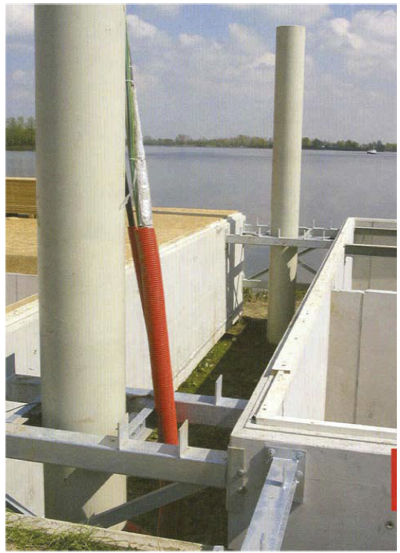 Амфибийные дома прикреплены к гибким причальным столбам и стоят на бетонном фундаменте. Если уровень реки поднимается, они могут подниматься и плавать. Крепления к причальным столбам ограничивают движение, вызванное водой. Плавучие дома опускаются, когда уровень воды понижается, и стоят на бетонном фундаменте (рис. 5).