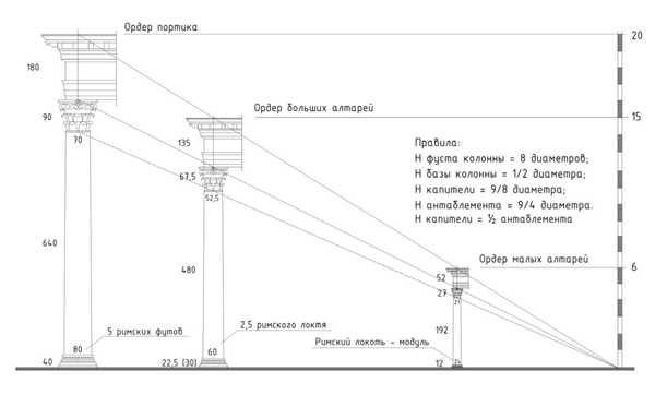 Рис. 1. Схема подобия ордеров Пантеона. Мера – римский дактиль; 0,0185 м = 1/24 римского локтя [8, с. 190]