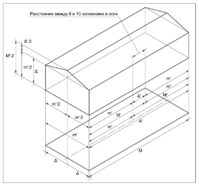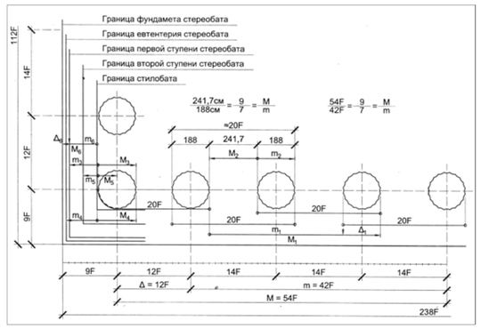 Рис. 6. Величины А, М, m и ∆ короткой стороны перистиля Парфенона. Автор А.В. Долгов