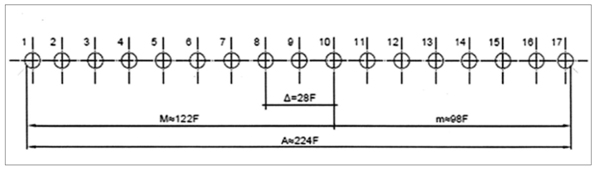 Рис. 5. Величина периметра основания угловой колонны и фута (F) в системе мажорно-минорной