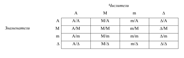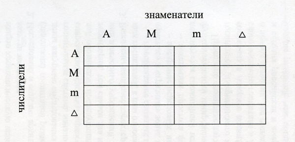 Таблица пропорций начальных линейных величин – таблица из 16 ячеек 4×4, в которой наглядно представлены все возможные пропорциональные отношения между начальными линейными величинами: А, М, m, ∆.
