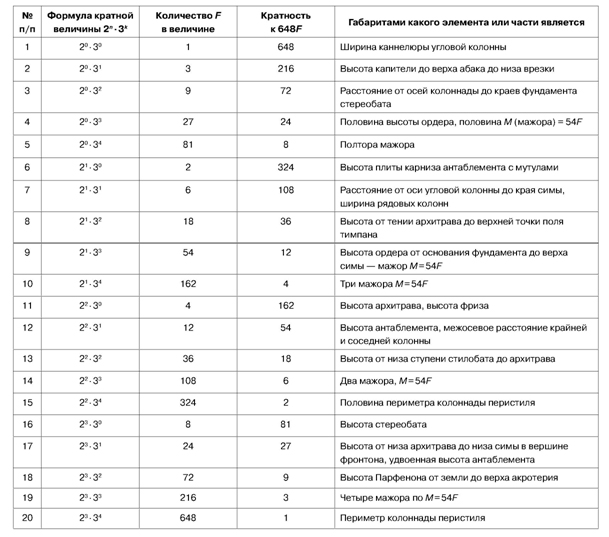 Выдающийся образец древнегреческой классики подтвердил гипотезу об эвритмии. Для него удалось установить доминирующее отношение (терминату) равное 9:7, которая присутствует в формах его плана, фасадов и разрезов. Была найдена основная измерительная единица (фут) Парфенона, существующая в натуре. Ей оказалась ширина каннелюры угловых колонн перистиля Парфенона. Тем самым была подтверждена роль симметрии, как категории, предписывающей обязательный изоморфизм архитектурных форм античных зданий. С ее помощью было установлено число протяженности периметра перистиля Парфенона, равное 648 футам, обладающее особенными свойствами, позволяющими ему быть наименьшим общим кратным для целочисленных величин, равных протяженностям разных элементов и частей здания Парфенона, что объясняется его многовариантной кратностью к 2 и 3. 648 = 23×34.