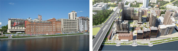 Реализуемый проект застройки территории бывшего завода имени В.В. Воровского в Екатеринбурге (справа).