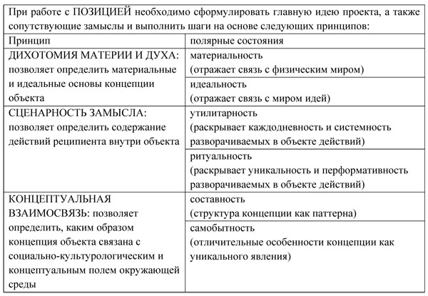VII. ПОЗИЦИЯ (ПОЛОЖЕНИЕ АРХИТЕКТУРЫ В КОНЦЕПТУАЛЬНОМ ПРОСТРАНСТВЕ) формируется через следующие принципы (табл. 7).