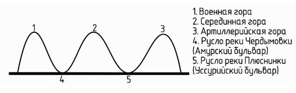 Застройка Хабаровска началась с трех водоразделов (Военная, Средняя и Артиллерийская горы), перпендикулярных береговой линии (рис. 1). Параллельно Амуру были проложены первые улицы – Береговая (Алексеевская) и Инженерная. Сама топонимика указывает на роль военного ведомства в основании города. Гарнизоны в основном размещались на Артиллерийской горе, в локации, известной сегодня как Волочаевский городок (рис. 2).