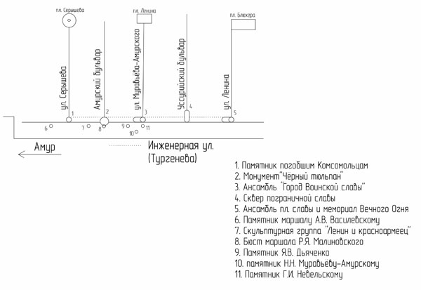 У подножия Комсомольца, застывшего в «летящем» ракурсе, начинается Инженерная улица (с 1912 по 17 г. – Романовская, в честь 300-летия правящей династии, ныне Тургеневская). Она спускается вниз по южному склону Военной горы к Амурскому бульвару, где открывается вид на монумент «Черный тюльпан» (монумент, отлитый из отстрелянных снарядных гильз и посвященный погибшим при выполнении интернационального и воинского долга в мирное время, арх. Ю. Кукуев, 1997). Далее Инженерная улица поднимается по северному склону Средней горы к площади со стелой «Город воинской славы», а затем к Комсомольской площади с гранитным обелиском, увековечившим память приамурских партизан. Затем улица спускается к Уссурийскому бульвару, прямо в сквер Пограничной славы (2018–1920, автор главный художник города, чиновник администрации С. Пеньков), включающего множество стел, барельефов, скульптур и шестиметровую арку; и вновь поднимается – по северному склону Артиллерийской горы к мемориалу Вечного огня и пл. Славы. Инженерная улица – главный маршрут в «каркасе памяти», связующая его основные объекты и пространства. Ключевые точки этого маршрута системой лестниц соединены с огромным прибрежным парком, носящим сегодня имя Н.Н. Муравьева-Амурского.