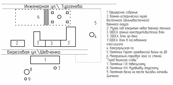 Параллельно Инженерной улице вдоль Амура была проложена улица с очевидным названием Береговая (Садовая, Алексеевская, ныне Шевченко), на которой рядом друг с другом расположены три важных объекта: бывшее здание Офицерского собрания, сложносоставной ансамбль ОДОРА, включающий блоки в конструктивизме, ар-деко и послевоенном классицизме, а также Военно-исторический музей Восточного (Дальневосточного) военного округа, основанный 9 мая 1984 г. в здании Государственного банка, с 1930-х гг. занимаемого военными учреждениями (в 1945 там размещался штаб 2-го Дальневосточного фронта). Во дворе музея под открытым небом экспонируется множество военной техники (рис. 5).