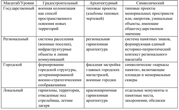 Рабочая гипотеза. Проявление темы служения и защиты Отечества предлагается рассматривать на трех уровнях: градостроительном, архитектурно-планировочном и символическом. В свою очередь, для каждого уровня можно выбрать государственный, региональный, городской или локальный масштаб (табл. 1).