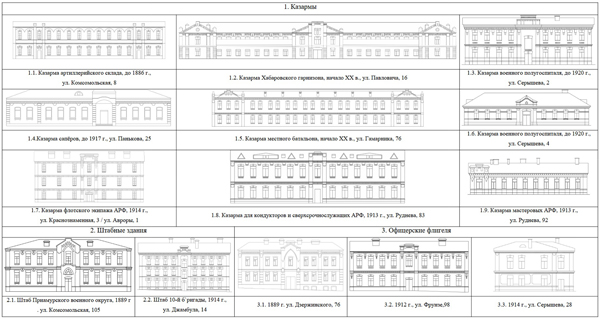 Более подробно хабаровская архитектура военно-силовых ведомств будет рассмотрена в отдельной статье. Так как большинство исторических построек военно-силовых ведомств используются по первоначальному назначению, мы не приводим фотофиксации, ограничиваясь схемами фасадов.