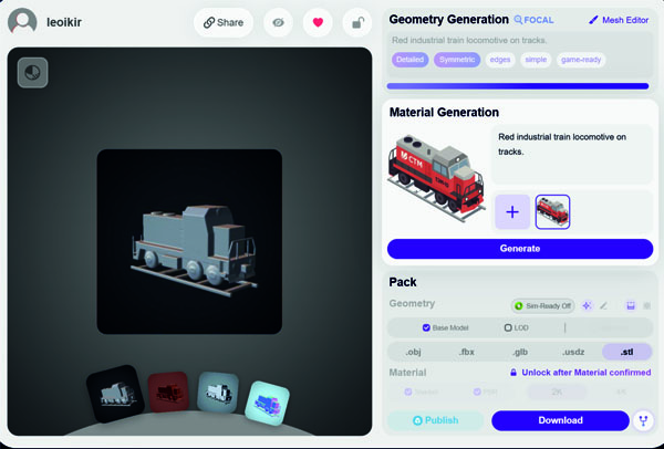Компании, производящие железнодорожную технику, используют цифровые двойники, которые помогают проектировать продукцию, проводить виртуальные испытания и оптимизировать производство. Например, взяв изображение двигателя Volvo и загрузив в нейросеть RodinAI [12] для генерации 3D-моделей на основе рисунков, получаем решение (рис. 7), которое можно использовать на начальных этапах проектирования, когда детализация второстепенна. Если воспользоваться 3D-сканером, то на это уйдет примерноот 5 минут, а нейросеть справилась менее чем за 2 минуты, но в обоих случаях необходимо дорабатывать 3D-модель в специализированных программах. Данная нейросеть использует продвинутые диффузионные нейросети, предназначенные для 3D-моделирования, а именно "roll-out diffusion". Поддерживает запросы "text to 3D" и "image to 3D", автор воспользовался последней для создания моделей. Она оказалось более полезной, чем рассмотренная ранее Vizcom и на данный момент в бесплатной версии есть возможность скачать модель в разных форматах.