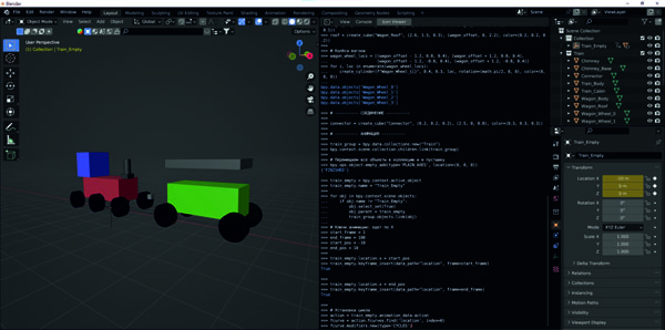 ChatGPT может также генерировать скрипт 3D-моделей с помощью модели "GPT-4", включающую огромное количество данных: документацию по Blender Python API, примеры 3D-моделирования и скриптов и т. д. Задав запрос в ChatGPT [3], автор написал код для создания 3D-модели поезда в Blender 3D [18]. Нейросеть выдара ответ, который был скопирован в программу (рис. 9). Есть головной состав и вагон, но дополнительно было предложено создание анимации и текстурирования, и нейросеть также соблюдала «культуру моделирования», а именно: в дереве моделей каждый объект имеет наименование и находится в группе, в дизайн-студиях это считается «хорошим тоном». Здесь также есть погрешности с расположением моделей, но все работает исправно (рис. 9).