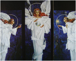 А.А. Покровский считал, что для красноярского мастера тема христианства была «главной в творчестве» [11. с. 14]. В качестве подтверждения укажем на такие его полотна, включенные в «Библейскую серию», как «Отче! В руки Твои предаю дух Мой» (2004. Х., м. 160х96), «Человек спасенный» (2005. Х., м. 163х280), и триптих «Ангелы Творения» (рис. 13), большой размер которых придает им качества монументальности, усиливая значимость идейного содержания.