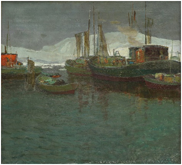 Ряузов часто писал преображающуюся природу, был внимателен к происходящим в ней переменам. Он часто писал огни на енисейских берегах, снега и льды, солнце в зените, на рассвете и на закате. На полотнах мастера «бегут по тундре олени, летят над водой перелетные птицы» [5, с. 365]. У Бориса Яковлевича на холсте «Дом-музей в Курейке» (1951. Х., м. 37х119) предстает перед зрителем вполне зрелым, состоявшимся художником. Холсты «Рыболовецкие суда» (рис. 2) и «На таежной речке» (1959. Х., м. 34х102) написаны в характерной для середины XX в. живописной манере. Внимательный зритель в туруханской или шушенской сериях увидит, что автора интересует больше природа Сибири или Крайнего Севера, чем сами памятные места, связанные с И.В. Сталиным или В.И. Лениным. Нет сомнения в том, что Б.Я. Ряузова привлекала именно красота пейзажа, любовь к которому проходит красной нитью через все его творчество.