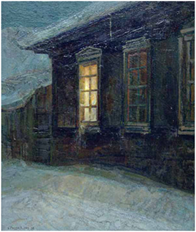 Пейзажи села Шушенского, входящие в серию полотен, посвященных местам сибирской ссылки вождя мирового пролетариата В.И. Ленина в село Шушенское в 1897–1900 годах, отличаются сдержанностью колорита и композиционной ясностью. Это в полной мере можно отнести и к работам, посвященным Туруханскому краю. Отметим полотно «Окно Ульянова» (рис. 3) за проникновенность и исповедальность образного содержания. Эта работа отражает такую важную черту Бориса Ряузова, как лиричность. Мастер избегает включать в пейзажи людей. Через изображение природы он выражает свою внутреннюю, субъективную реальность. Военные работы все же передают разрушения и страдания, свойственные этому времени. Мирные или военные пейзажи у красноярского живописца всегда направлены на передачу внутреннего состояния человека, эмоций, мыслей и чувств, жизненного опыта. Ряузов старался показать людей, занятых трудом, их традиционную культуру, верования и обычаи. При этом Север оставался главным героем его полотен. Это характерно для таких работ, как «Снега ильды» (1959. Х., м. 37,3х107,5), «Северный пейзаж» (1973. Х., м. 36х51), «Енисей у Курейки» (1984. Х., м. 57х85,5), «Северное солнце» (1977. Х., м. 40х50), «Тундровые огни» (1965. Х., м. 41х120), «Север. Далекий поселок» (1982. Х., м. 76х119) и «Обское Заполярье» (1975. К., м. 50х60). В перечисленных полотнах Ряузов передает свои мысли, чувства и настроения посредством цвета и фактуры, представляя труд северян и природу во всей ее полноте.