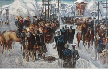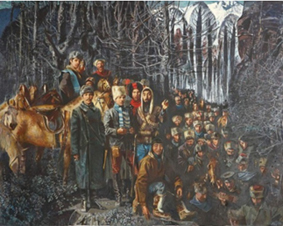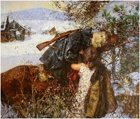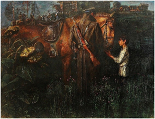 Анатолия Знака всегда интересовали события 1917–1920 гг. в Сибири. Над этой темой он начал работать еще в годы учебы в институте. Результатом этого стали такие его работы, как «Конец колчаковщины» (рис. 5), «Партизаны Щетинкина и Кравченко» (рис. 6), «Братья» (рис. 7), «Красноярск 1905 года» (1971. Х., м. 150х195), «Маевка–1905 в Красноярске» (1973. Х., м. 130х184), «Отъезд Ленина из ссылки» (1991. Х., м. 130х125), «Прощание» (рис. 8). Несмотря на то, что все эти произведения были написаны в эпоху развитого соцреализма, в 1970–1980-е гг., красноярскому живописцу удалось не делать акцентов на политической составляющей событий. Необходимо отметить, что в перестроечный период достоверные данные о событиях революции и гражданской войны были доступны лишь специалистам по отечественной истории. Анатолий Знак раскрыл эту тему беспристрастно как трагедию русского народа, что стало залогом актуальности этих работ до настоящего времени. Например, полотно «Конец колчаковщины» посвящено событиям зимы 1920 г. в Красноярске. Художник передал несправедливость братоубийственной войны, не оправдывая и не обвиняя никого. Пейзаж здесь – не просто фон, но и способ передать эмоциональное состояние героев и придать изображенным событиям пафос древнегреческих трагедий.