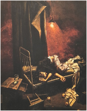 Среди работ выдающегося красноярского художника Александра Ивановича Волокитина есть много замечательных портретов, часть которых анализируется в данной работе. Живописные произведения мастера, участвующие в выставках различного уровня, резко «выделяются среди работ других авторов мастерством и запоминаются публикой» [9, с. 23]. Александр Волокитин часто находил героев своих портретов среди нищих, отверженных обществом людей, но отзывчивый зритель заметит, что они обладают немалой духовной силой. С полотен Александра Волокитина смотрят даже не лица, а лики. Художнику были интересны люди, много испытавшие в своей жизни. Мастер стремился показать не столько человека, сколько его судьбу, характер. Внимание к людям, находящимся в ситуации сложного морального выбора, появилось у Волокитина еще в период его учебы в институте. Результатом этих размышлений стала дипломная работа «Покаяние» (1992. Х., м. 215х127), в которой автор, несмотря на болезненность и острую социальность темы, все же верит в своего героя, в его духовное очищение, в то, что он сделает верный выбор. Дипломная работа выполнена на высоком профессиональном уровне, поэтому холст «Покаяние» (рис. 9) вуз представлял на выставках дипломных работ [10, с. 213].