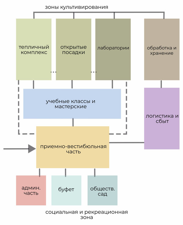 Функциональная организация центра экоурбанистического земледелия предполагает многослойную, иерархически структурированную систему пространств, обеспечивающих взаимосвязь между агропроизводственными, общественными, образовательными, рекреационными и инженерными компонентами. Схема опирается на принципы гибкости, открытости, модульности и биофильности (см. рисунок).