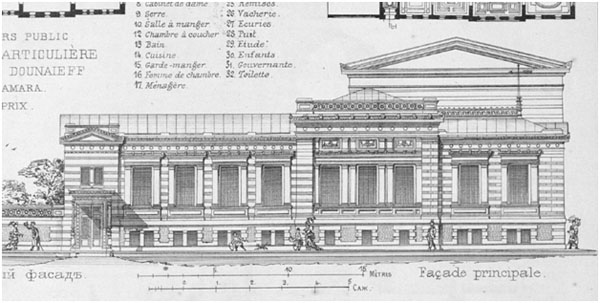 Мы полагаем, что при реконструкции дома Дютель взял за основу проект (в части фасадного решения), выполненный в 1879 г. архитектором Гронвальдом для строительства особняка Дунаева в Самаре (рис. 9). Фасадное решение выполнено в соответствии с проектом в духе стилизаторской архитектуры – неоренессанса. Проект Дютеля был реализован с небольшими изменениями, но гораздо меньшими, чем особняк Дунаева.