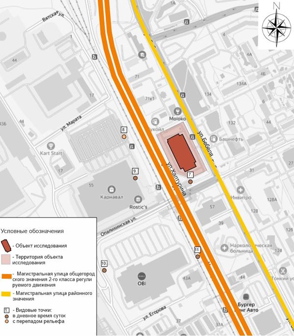 Метод анализа восприятия архитектурного объекта посредством построения видовых кадров дает возможность изучить экстерьер «Конгресс-отеля Екатеринбург» в контексте пространства с разных точек обзора [5] (рис. 5). Отсутствие открытой площади перед объектом (стесненные городские условия) и его крупные габариты ограничивают возможность целиком увидеть фасад, форму здания с близкого расстояния (рис. 6а). Силуэт здания, детали комфортно воспринимать на отдалении, например, воспользовавшись площадками соседних объектов (многоуровневый паркинг и площадь ТРЦ «Карнавал», открытая парковка ТЦ «ОБИ») (рис. 6 б, в). Наиболее интересный вид здания открывается с видовых точек городских магистралей Бебеля, Халтурина (рис. 6г), которые ограничивают участок с двух сторон.