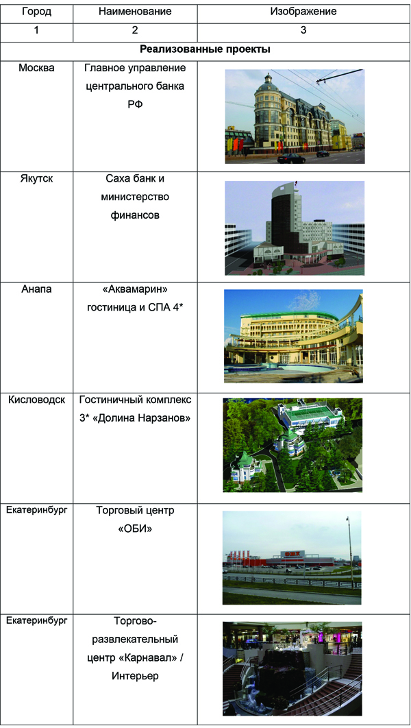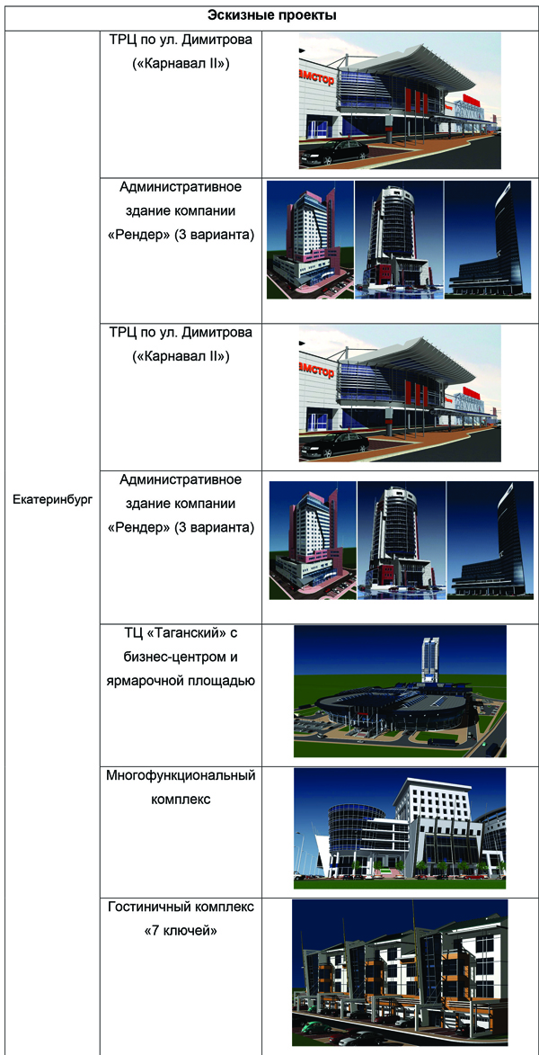 Многофункциональный комплекс, известный сегодня как «Конгресс-отель Екатеринбург», – не первый проект Лисичича. Среди его работ – главное управление центрального банка РФ (Москва), Саха банк и Министерство финансов Якутии (Якутск), «Аквамарин» гостиница и СПА (Анапа), гостиничный комплекс «Долина Нарзанов»(Кисловодск), торговый центр «ОБИ», интерьер торгово-развлекательного центра «Карнавал» (Екатеринбург), а также объекты в других городах России, Сербии и ОАЭ. Помимо реализованных объектов архитектор разработал множество эскизных проектов, в столице Урала их несколько: ТРЦ на ул. Димитрова («Карнавал II»), административное здание компании «Рендер», ТЦ «Таганский» с бизнес-центром и ярмарочной площадью, многофункциональный комплекс, гостиничный комплекс «7 ключей» [3] (табл. 2).