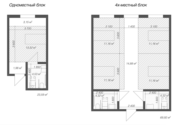 - проектирование в рамках обоснованного рекомендуемого (т.е. минимального) метража для одноместного блока 23,5 м2, из которых: организация спальной зоны имеет габариты ширины в 3,6 м и глубины 3,7 м (13,32 м2), минимальные 5,68 м2 для активностей и хранения (стола, стула, гардероба, тумбы), 4,5 м2 – санузел, оборудованный душем, раковиной и унитазом; для 4х-местного блока 70 м2: 13,32х4 (53,28) м2 прикроватной зоны + 4,5*2 (9) м2 раздельного санузла + 7,72 м2 зоны активностей и хранения;
