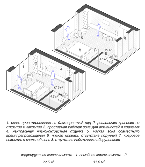 Предпосылки необходимости разработки рекомендаций. В здравоохранительной системе получают развитие патронажные службы поддержки населения, что призвано обеспечивать автономию человека в привычных условиях. Государственные и общественные программы пытаются уловлетворить потребности пожилых людей благодаря строительству доступного, адаптированного для МГН жилья и кондоминиумов с обслуживанием, однако даже подобные стратегии в определенной степени не подходят для людей с деменцией [8]. К примеру, из-за снижения когнитивных способностей и развития патологических поведенческих синдромов как блуждание и измененная чувствительность к окружающим условиям обозначенный тезис о недостаточности стандартного инклюзивного дизайна обнаруживает себя в необходимости создания рекомендаций по адаптации жилого пространства под новые нужды его жителя. Таким образом, в настоящей работе предлагаются к рассмотрению подходы организации жилых блоков в социально-медицинских центрах, а также тактики адаптации жилого пространства дома, расширяющие рекомендации актуального свода правил по проектированию лечебно-профилактических учреждений (ЛПУ) и дополняющие корпус существующих научных материалов.