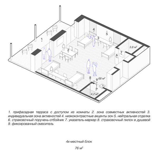 Создание группового блока до 2–4 человек может быть рациональным, если существуют значительные ограничения технико-экономических ресурсов или в силу тяжелого малоподвижного состояния пациентов, например в отделении хосписа и паллиативной помощи. Однако гарантия индивидуального пространства должна быть предусмотрена для всех проживающих. Для этого могут применяться передвижные ширмы или завесы, трансформируемые перегородки, а достаточное меблирование комнаты призвано предоставить индивидуальное место для размещения личных вещей, крупногабаритной поклажи, верхней одежды, собственное место для питания, отдыха и работы. Дополнительно в групповых блоках стоит учитывать зоны для совместных активностей людей одного блока – общий стол, мягкая зона, общая терраса.