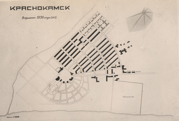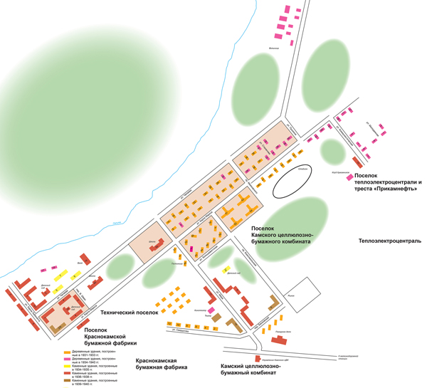 Во второй половине 1920-х гг. проект комбината в среднем течении р. Камы продвигал «Центробумтрест»2. Создание в мае 1929 г. конторы «Бумстрой» в структуре Бумажного директората ВСНХ РСФСР позволило централизовать проектно-строительные работы в целлюлозно-бумажной промышленности. За период существования конторы (1929–1931) было разработано несколько вариантов планировки рабочего поселка для предприятий Закамского района (целлюлозно-бумажный комбинат, бумажная фабрика Гознака, теплоэлектроцентраль, трест «Волгокаспийлес»). Селитебная часть ограничивалась р. Пальтой на северо-востоке, промышленной зоной на юге (на берегу р. Камы), заболоченной местностью на востоке. Парковая зона выходила на юге к реке.