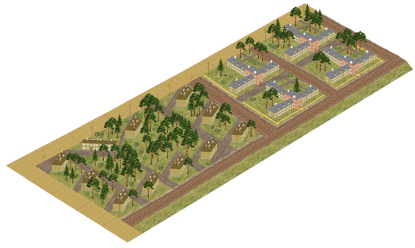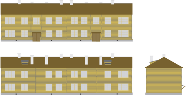 Второй квартал состоял из двухэтажных деревянных домов, ориентированных на улицы под углом. Они не сохранились, и реконструкция возможна на основании планов застройки и фотоматериалов (рис. 10). Это бревенчатые дома на два подъезда по четыре квартиры (2- и 3-комнатные) в каждом. Были подобраны оттенки лесоматериалов, кровли. Нарисованы фасад, сторона, выходящая во двор, и торец здания (рис. 11). Созданы статичные 3D-модели двухэтажных домов для реконструкции второго квартала соцгорода.