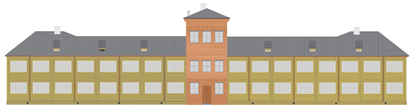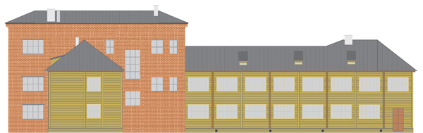 Одними из первых капитальных строений рабочего поселка стали «дома-аэропланы» (они присутствуют на планах рубежа 1920–1930-х гг.). Их название обусловлено модной для того периода планировкой и обликом. К трехэтажной секции в кирпичном исполнении были пристроены двухэтажные секции в деревянном исполнении – крылья и хвост. Было построено четыре здания (рис. 6). Сложность их реконструкции заключается в том, что они снесены. Сохранилась часть одного дома – трехэтажная секция в кирпичном исполнении (ул. Большевистская, 52) (рис. 7). На основе этих данных были подобраны оттенки кирпичной кладки, лесоматериалов (на момент строительства были светлее), кровли. Были нарисованы фасад (рис. 8) и торец здания (рис. 9), создана статичная 3D-модель «дома-аэроплана» для реконструкции первого квартала соцгорода.